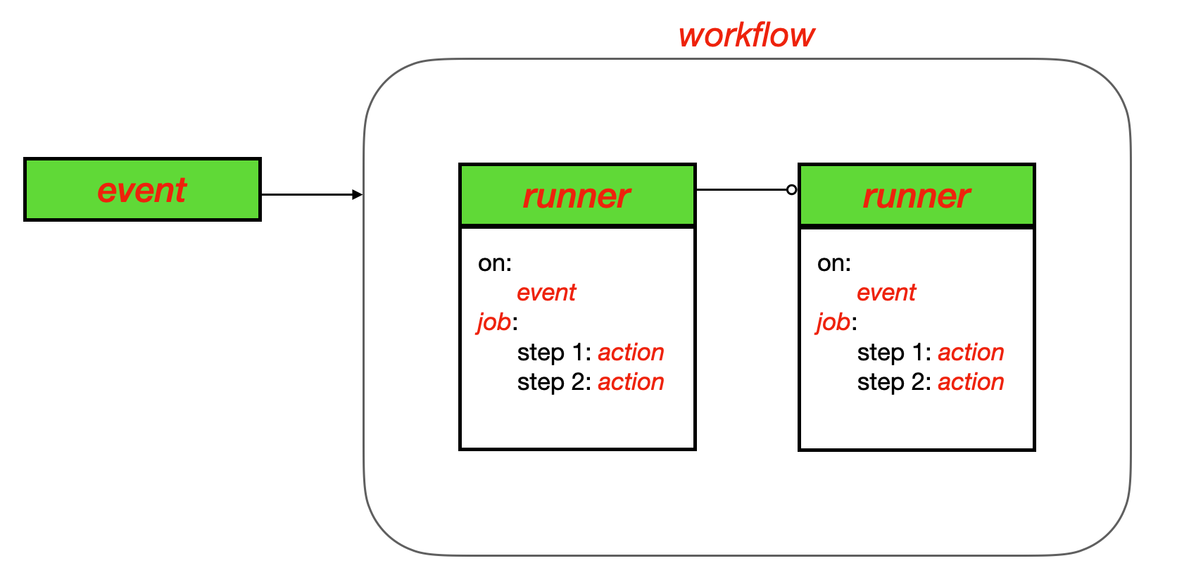 Understanding a few key concepts will help you get started with GitHub Actions, so let's begin with an overview. The diagram below shows how the different components interact, and we'll describe each one in detail.